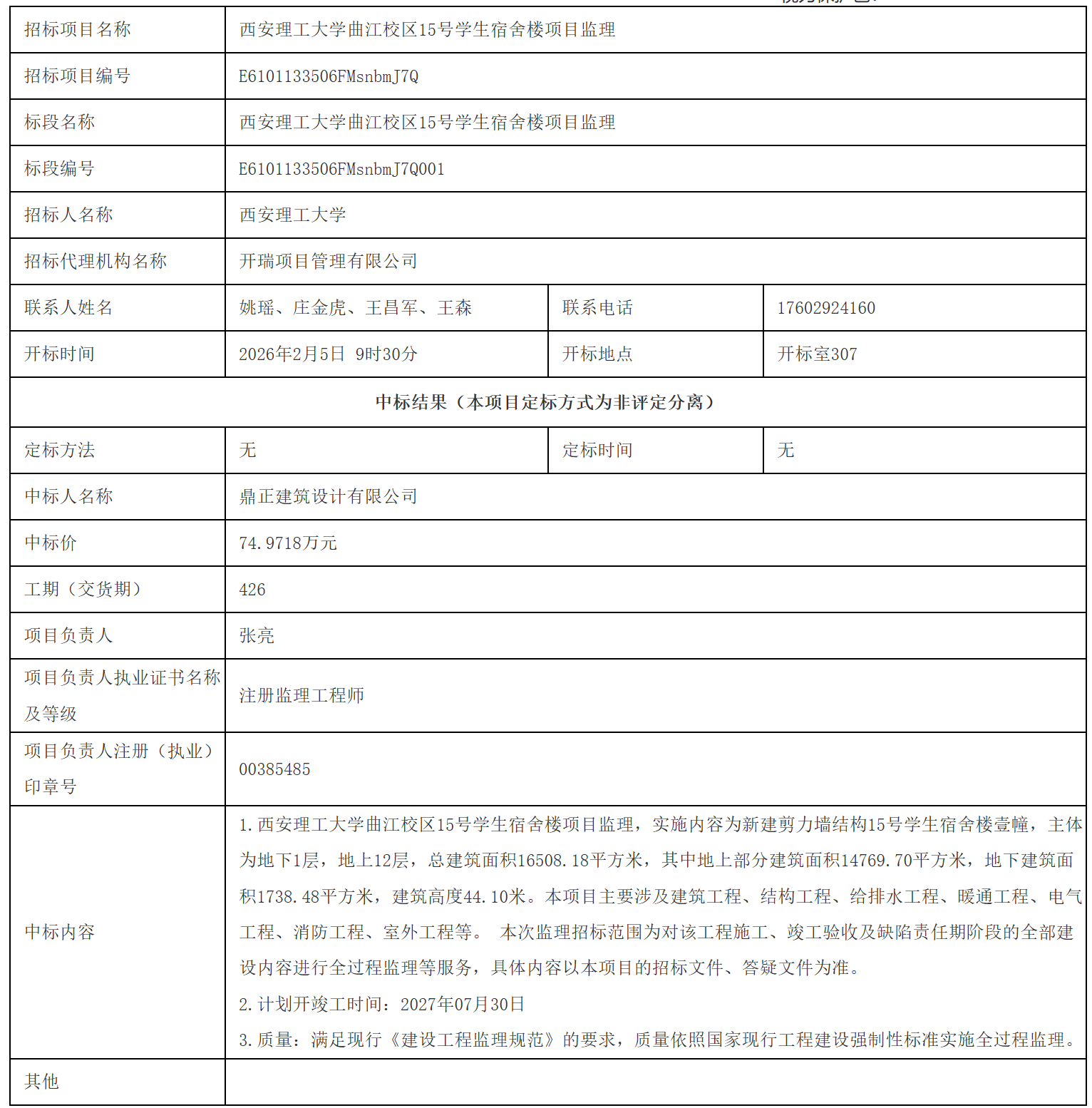 【监理服务】beat365正版唯一官网必一曲江校区15号学生宿舍楼项目监理中标结果公告