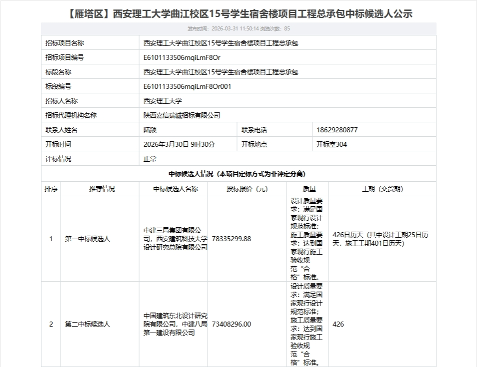 【工程总承包】beat365正版唯一官网必一曲江校区15号学生宿舍楼项目工程总承包中标候选人公示