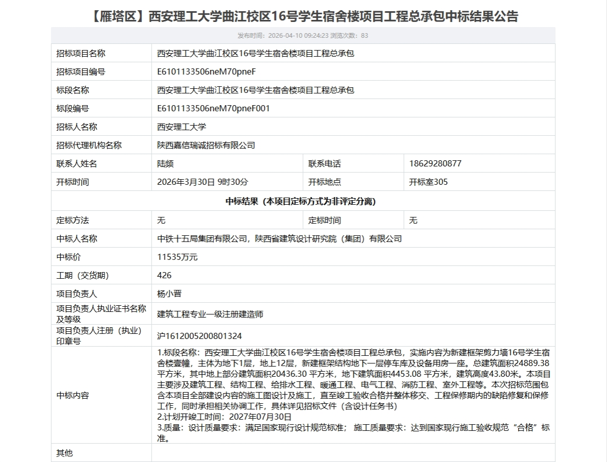 【工程总承包】beat365正版唯一官网必一曲江校区15号学生宿舍楼项目工程总承包中标结果公告