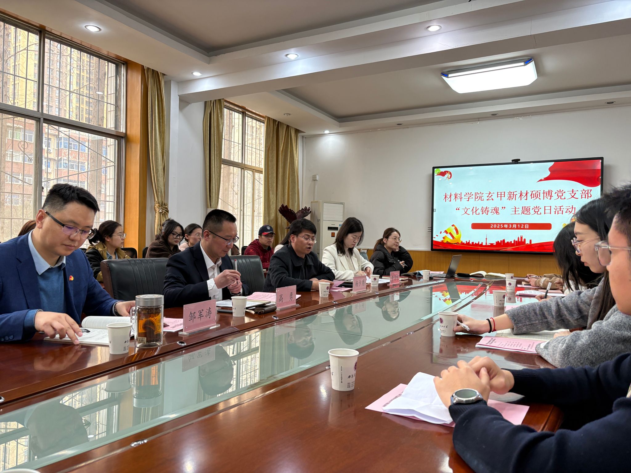 相关领导为支部党员授予“玄甲新材文化桌牌”,材料学院党委书记邹军涛对此次组织生活会进行了点评,材料学院相关人员及玄甲新材硕博党支部全体成员参加会议。