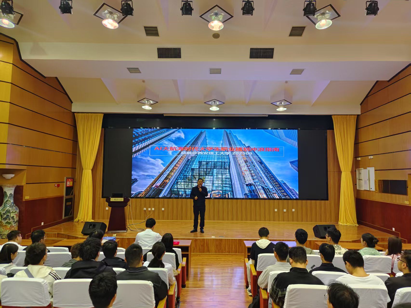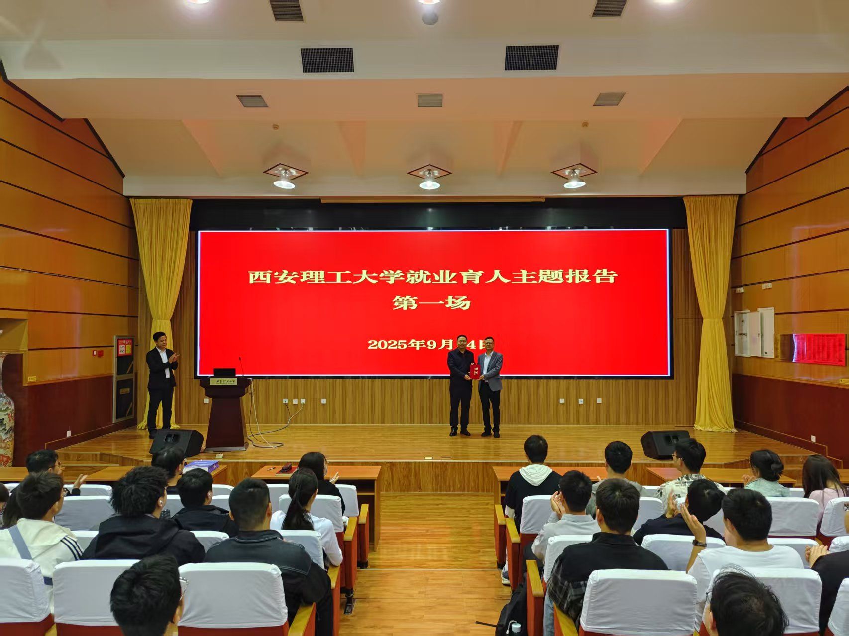 为助力beat365官网学生在AI时代树立正确的职业价值观,9月24日,在金花校区图书馆报告厅举办就业育人主题报告会。报告会特邀西安国家级产业园区集群人才服务与产学合作负责人蔡鹏担任主讲嘉宾,校党委副书记张存库出席活动。来自全校各年级300余名学生参加了此次活动。