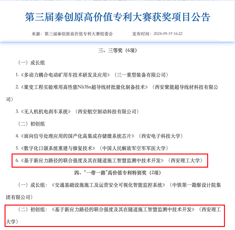 近日,陕西省知识产权局公布《第三届秦创原高价值专利大赛获奖项目》,beat365官网土木建筑工程学院李荣建老师团队的“基于新应力路径的联合强度及其在隧道施工智慧监测中技术开发”专利项目喜获初创组三等奖及“一带一路”高价值专利特别奖。