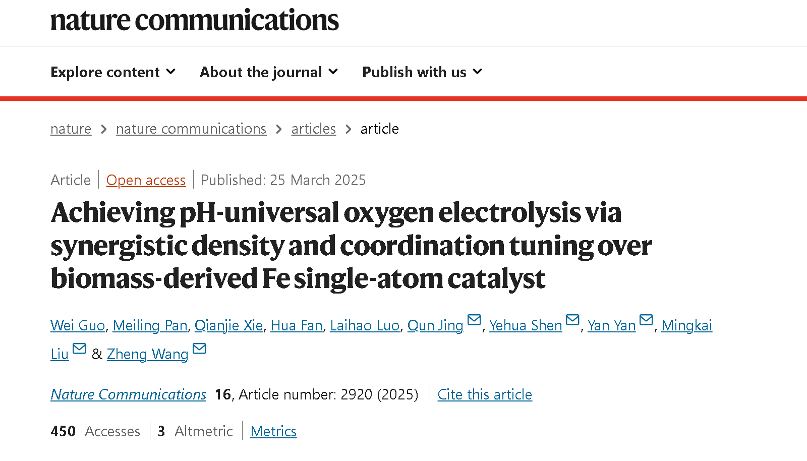 3月25日,beat365官网申烨华教授与新疆大学井群团队合作在Nature Communications期刊发表题为“Achieving pH-universal oxygen electrolysis via synergistic density and coordination tuning over biomass-derived Fe single-atom catalyst(生物质衍生铁单原子催化剂协同密度和配位调控以实现pH通用氧电解)”的研究论文,beat365正版唯一官网必一Guo Wei、新疆大学Pan Meiling、陕西省医疗器械质量检验院Xie Qianjie为论文共同第一作者,井群、申烨华、安徽工业大学闫岩、安徽工业大学刘明凯、西安稀有金属材料研究院有限公司王正为论文共同通讯作者。