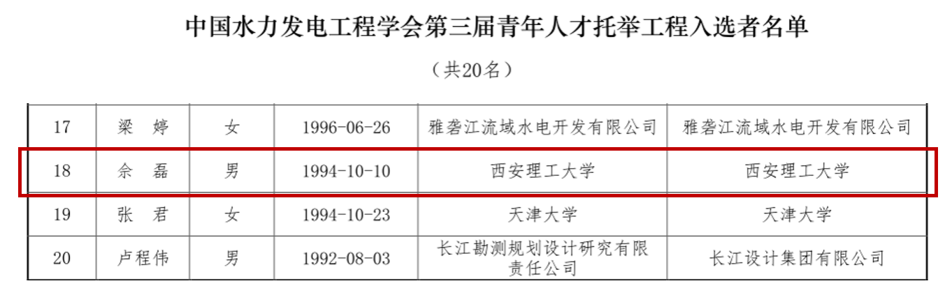 日前,中国水力发电工程学会公布了第三届青年人才托举工程入选者名单,beat365官网水利水电学院佘磊副教授依托校科协申报入选,并受邀参加了2025中国水力发电工程学会青年科技论坛。